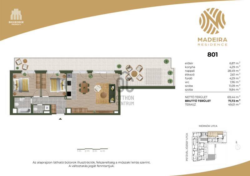 Projekt bemutatásaA projektrőlKépzeld el, ahogy belépsz Újbuda egyik legbékésebb, zöldövezeti utcájába, ahol a nyugalom átveszi a helyét a város zajos ritmusától. A Mérnök utcában, a Fehérvári út és az Etele út találkozásának közelében, egy elegánsan modern épület rajzolódik ki előtted – ez a Madeira Residence.Ahogy közelebb lépsz, a homlokzat letisztultsága, a loggiák ritmikus váltakozása azonnal megragadja a tekinteted. A pálcás korlátok finom eleganciát sugároznak, a napfény pedig játékosan tükröződik a teraszok üvegfelületein. Már kívülről is érezni: ez nem csupán egy lakóépület, hanem egy életérzés.Az első emeleti lakások egy része saját tetőkerttel rendelkezik – képzeld el, ahogy reggel a kávédat kortyolgatod a saját kis zöld oázisodban, miközben a madarak csicsergése tölti be a teret. Minden lakásban ott a tágas nappali, a kényelmes hálószobák, és a saját erkély vagy terasz, ahol a nap bármely szakában megpihenhetsz.A Madeira Residence nem csupán egy új építésű társasház – ez egy hely, ahol a modern életstílus találkozik a természet közelségével és a családbarát környezettel. Egy otthon, ahol minden nap élmény.A belső térben a kényelem és a fenntarthatóság kéz a kézben jár. A mennyezeti hűtés-fűtés rendszer csendesen gondoskodik a kellemes hőmérsékletről, az okosotthon-előkészítés pedig lehetővé teszi, hogy a technológia valóban a kényelmedet szolgálja. A mélygarázsban kényelmes parkolás vár, a kerékpártárolók és az elektromos autótöltési lehetőség pedig a környezettudatos életmódot támogatják.A környék infrastruktúrája kiváló: a közelben kiépített kerékpárutak, car sharing szolgáltatások és elektromos rollerek teszik egyszerűvé és fenntarthatóvá a közlekedést. A családosok számára külön öröm, hogy több játszótér is található a közelben – a gyerekek biztonságban, szabadon játszhatnak, miközben a szülők nyugodtan élvezhetik a környék nyugalmát.A Madeira Residence nem csupán egy új lakóépület – ez egy életérzés, ahol a mindennapok élménnyé válnak.