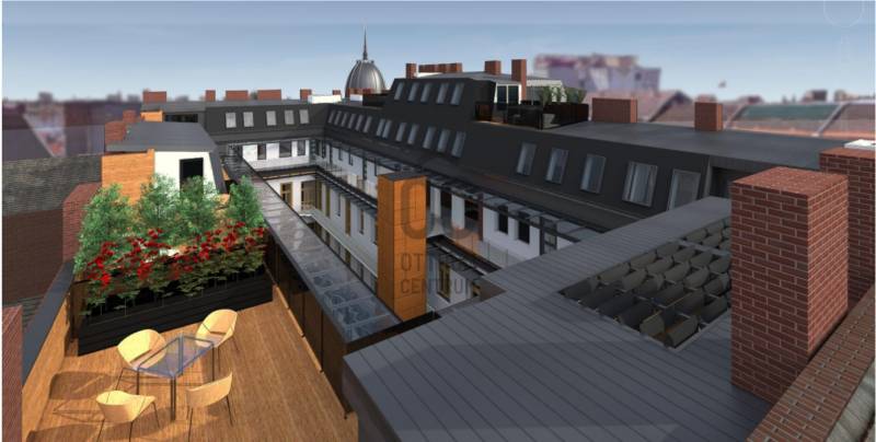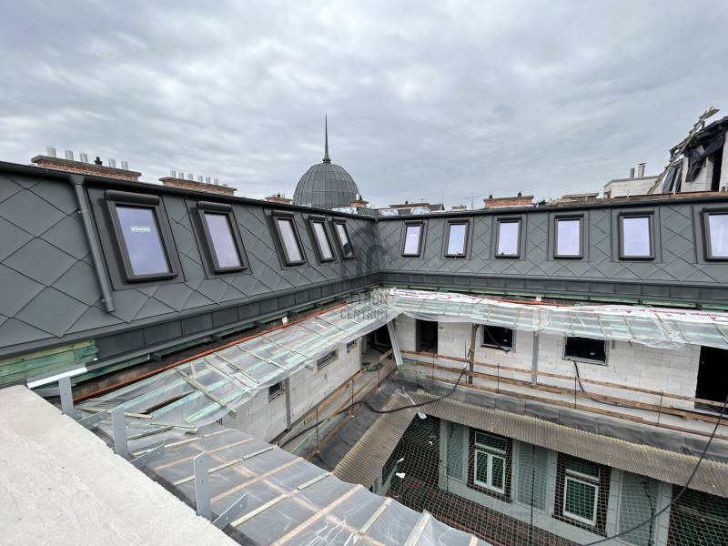 Exkluzív környezetben, műszakilag és esztétikailag a jelen elvárásainak megfelelően megtervezett és kivitelezett 76,445 m2 alapterületű, nappali-konyha-szoba beosztású lakás, 29,65 m2 terasszal eladó.A lakás Petschacher Gusztáv tervei alapján készült épület 5.emeletén helyezkedik el, kétszintes, ablakai a csendes belső udvarra néznek.Kedvező beosztású, az alsó szinten a konyha, nappali és hálószoba, a felső szinten a tetőterasz található. Az előtértől jobbra a 12 m2-es hálószoba, balra a 28 m2-es tágas, világos nappali van, egy légtérben konyha-étkezővel. A fürdő a hálószobából közelíthető meg, a toalett közvetlenül az előtérből nyílik.A lakás hűtéséről és fűtéséről oldalfali fan-coil rendszer gondoskodik. Riasztórendszer kiépítésre kerül. A hidegburkolatok (konyha, fürdőszoba, közlekedők) alatt padlófűtés kerül elhelyezésre. A lakások hűtését és fűtését H tarifás hőszivattyús rendszer biztosítja, így a lakások energiaellátásának költsége nagyon kedvező.A lakásokba a műszaki tartalomban szereplő konyhabútorok és gépek kerülnek beépítésre.A burkolatok és a konyhabútor színe tetszés szerint választható, a kijelölt opciók közül. Megfelelő időben történt megrendelői módosításokra lehetőség van.Projekt bemutatásaA lakások az UNESCO világörökség részét képező műemlék védettség alatt álló épület tejesen új építésű tetőterében helyezkednek el.A lakások legkésőbb 2023 szeptemberétől beköltözhetőek.A lakások mind saját lakásnak, mind értékálló befektetésnek is kiválóak. A már kivitelezés alatt álló 15 lakásos projekt keretében eladásra kínált változatos méretű egyszintes, belső kétszintes, illetve háromszintes luxus lakások nagyméretű tetőterasszal, télikerttel a legmagasabb igényeket kielégítő kivitelben készülnek.ELHELYEZKEDÉS:A lakások elhelyezkedése minden szempontból kedvező, kiváló közlekedési kapcsolatokkal. Közel a Pesti Broadway, pár perc sétára van a Zeneakadémia, az Operaház, az Operettszínház, a világörökség részét képező Andrássy út, a Liszt Ferenc tér, továbbá a Király utca, a Gozsdu udvar, amely a Budapest belvárosának egyik legdinamikusabban fejlődő központja, egy találkozási pont, ami összeköti a szórakozást, a gasztronómiát és a kultúrát. A szórakozó negyed a hét minden napján egyedülállóan izgalmas programokkal várja vendégeit.INGATLANOK:Exkluzív környezetben, műszakilag és esztétikailag a jelen elvárásainak megfelelően megtervezett és kivételezett 64-154 nm alapterületű, teraszos lakások eladók.Az új lakások a luxus minden elemével rendelkeznek, modern otthont teremtve a lakóknak, míg a világörökség részét képező, 1895-96-ban Petschacher Gusztáv tervei alapján épült eklektikus épület őrzi a régi hangulatot, amely az építés során felújított homlokzattal hangsúlyossá válik. Tradicionális környezetben teremt - a luxus minden elemével rendelkező - modern otthonokat.ÜTEMEZÉS:Az építkezés a januárban meghatározott ütemnek megfelelően, késedelem nélkül halad:- a tetőszerkezetet tartó acél keretállások elkészültek, továbbá a műemléki bádog tető fa fogadó részének a felrakása befejeződött, melyet követően az épület teljes lefedése megtörtént.- az udvarra kerülő 8 személyes új Kone lift tartószerkezete kész és 2023 márciusára a lift üzembe helyezése is megtörténik.- a homlokzat felújítás elindult.- a lakások falainak építése, az elektromos és gépészeti munkák is elindultak és megfelelő ütemben folynak.MŰSZAKI TARTALOM:PADLÓBURKOLAT- Beltér -A belső lépcső, kerámia burkolat készül, a megajánlott alap burkolattal. Opcionálisan lehet választani faburkolatot mely megegyezik a svédpadló anyagával. A belső vizes helyiségben, a belső lépcsőkön és a konyhákban, valamint a nappali terében elhelyezkedő konyhai területeken matt kerámia készül.A fürdőszoba egyik falára választható opciós burkolat. A nappali terekben és a hálószobákban svédpadló kerül lefektetésre.- Kültér - A teraszok, és a függőfolyosók csúszásmentes fagyálló kerámia ill. greslap burkolatúak, teljes felületű, üregmentes, flexibilis és fagyálló ragasztással.FALBURKOLAT- BeltérA vizes helyiségben ragasztott kerámia vagy greslap falburkolat készül álmennyezet alsó síkjáig.A pozitív éleket sarokprofillal lesznek kialakítva. A konyhákban a falon csak a konyhabútor és a felső szekrény között készül fali kerámia burkolat.Belső festések min.2 rtg. diszperziós fehér falfesték falakon, mennyezeten- Kültér -A teraszoknál külső Trespa falemezes burkolat kerül a határoló falakra, tölgy színben.NYÍLÁSZÁRÓK- Beltér -Három oldalon falcolt, vázszerkezetű Mantu Echt ajtók kerülnek furnérozott ajtólapokkal, eloxált alumínium kilinccsel és körrozettával.- Kültér - A lakásokhoz tartozó külső nyílászárók rendszere: Gealan S9000 ötkamrás, 3 rétegű, kiváló hang és hőszigetelést biztosító rendszer, kívül barna, belül fehér színű, távirányítóval működő külső redőnnyel. A tetőteraszok tolóajtó szerkezetűek.A tetősíkba beépített ablakok Fakro típusúak, elektromos mozgatású redőnnyel, belül fehér, kívül szürke. Ahol szükséges, betörésbiztos balesetvédelmi biztonsági fóliával ellátott üvegezéssel készül.Az öt ponton záródó, acéltokos lakásbejárati ajtók a hatályos előírásoknak megfelelő biztonsági szinttel, a vonatkozó klímaosztálynak megfelelően készülnek, barna színben.KONYHABÚTORA konyhában beépített süllyesztett led munkafénnyel készül, az ajtók színével azonos színvilágú, 18 mm vastagságú bútorlap kerül beépítésre. A munkalap színe választható. A mosogató pult s